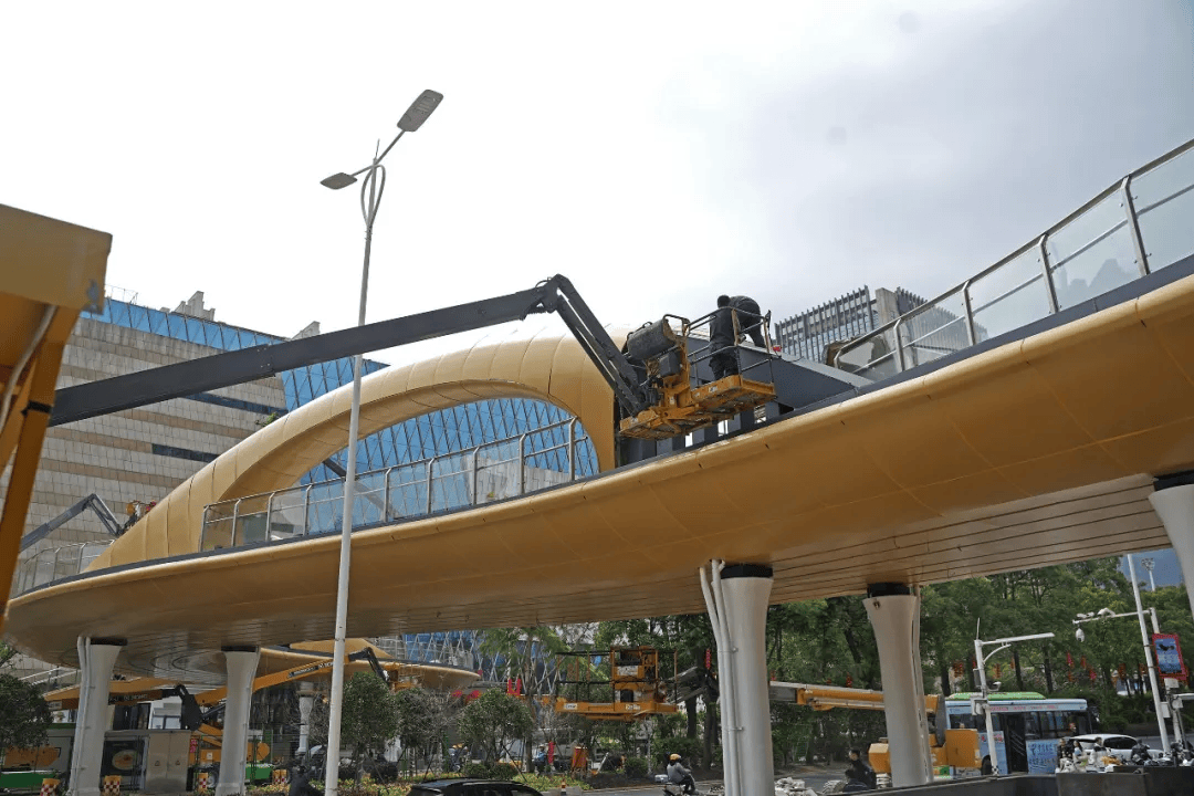 现场可见,近百米长的钢箱梁如长虹横跨道路上方,桥体结构完整、气势初显。施工人员正在进行遮阳棚铝单板安装、无障碍电梯调试、夜景灯光布置及桥下地面铺装等收尾作业,现场施工井然有序。